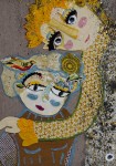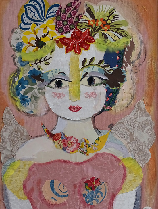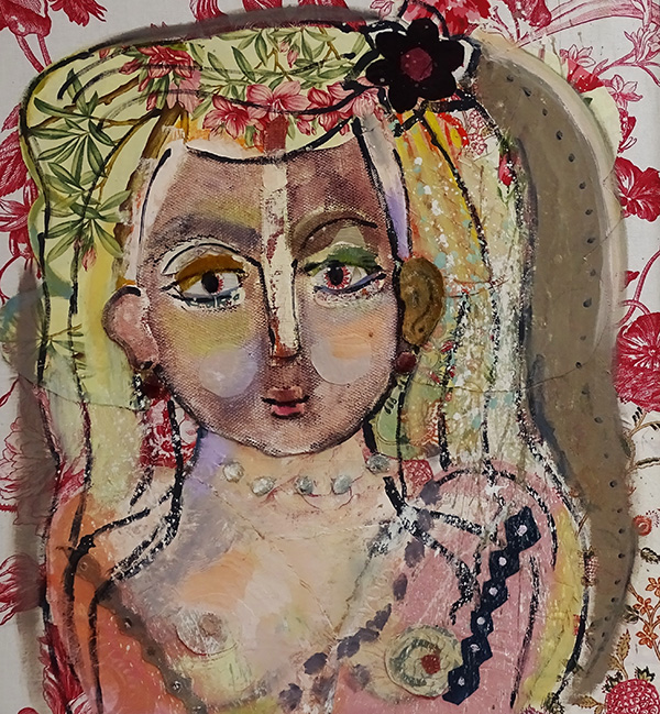Née en 1967, vit et travaille près d’Angers. Depuis plus de trente ans, Katherine Roumanoff explore le portrait textile comme un espace d’investigation de l’identité et de la mémoire. Installée au bord de la Loire, à proximité d’Angers, elle développe une œuvre qui interroge la façon dont la matière, les motifs et les textures traduisent nos histoires visibles et invisibles. Designer de formation, également autrice et illustratrice, elle a trouvé dans le tissu un médium plastique qui dépasse l’ornement pour devenir langage et mémoire. Cette relation intime au textile remonte à l’enfance, imprégnée par les étoffes orientales que ses parents importaient dans les années 1970. Ces surfaces chargées de motifs répétitifs, de symétries et d’arabesques l’ont initiée très tôt à un monde visuel où chaque fragment porte une histoire et accompagne les êtres humains dans leur quotidien. La création de costumes de théâtre, quelques années plus tard, lui a révélé la puissance de la matière textile dans la construction et l’expression d’une identité et l’incarner scéniquement. Dans ses portraits, l’artiste compose sans dessin préalable, à la façon de Matisse avec ses papiers découpés, elle découpe directement dans la matière. En juxtaposant les étoffes, elle laisse surgir une figure qu’elle assemble par collage. Chaque matériau — velours, soie, jacquard, toile de Jouy, brocard et cotonnade — agit comme une strate temporelle et culturelle. Le textile devient à la fois fragment d’histoire, trace artisanale et support symbolique. Le visage, lieu de projection identitaire par excellence, se constitue alors dans une tension entre hétérogénéité et unité, dispersion et recomposition. « Quand je crée, je suis sans doute proche d’un état de transe : j’ai la sensation de me laisser guider par les matières, les motifs, les couleurs. L’hypnose m’a aussi permis d’approfondir ma connaissance des mécanismes de l’inconscient, des mémoires enfouies, des blessures transgénérationnelles. Le visage révèle ce qui ne peut se dire, ce que l’on cache. Il parle malgré nous des peurs, des désirs et des forces invisibles qui nous traversent et nous façonnent. Il en dit plus que ce dont nous avons conscience. Ce qui m’intéresse, c’est d’inscrire sur la toile l’instant dense et fugitif où l’âme s’échappe. L’aspect psychologique réside dans ma nature profonde. En mettant en scène des personnages, seul à seul, en relation avec la nature, avec eux-mêmes, ou à deux, je m’intéresse à la relation que l’on entretient avec soi-même, à nos dialogues intérieurs, à nos hésitations du cœur. Je cherche à révéler, à dévoiler le mystère de nos fonctionnements. J’espère que de mes œuvres se dégage une certaine beauté, celle de l’harmonie, de l’apaisement, de la sérénité, ainsi qu’une poésie, celle du plaisir d’exister dans une ouverture au monde. C’est ce que je souhaite à tous : que chacun et chacune se glisse à l’intérieur de lui-même et accepte sa propre multitude, sa richesse intérieure infinie et que cette acceptation ouvre toutes les portes. »