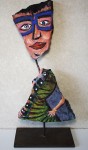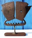Né en 1977, vit et travaille à Derval 44. Bac pro, horticulture, spécialité plantes tropicales. Travaille un temps en jardinerie puis traverse le Sahara, direction Mauritanie, au volant d’une 505. Magasinier, voyage au Mexique, Bolivie, Pérou. Valet de chambre, dans les Alpes pendant une saison d’hiver. Vend des sapins de Noël, travaille quelque temps dans la rénovation de l'habitat pour une entreprise de Saffré "Rénove Habitat Service". Il est membre fondateur de l'association Recycle et Don, basée à Conquereuil, dont il sera salarié pendant 2 ans. Il va ensuite devenir intermittent du spectacle et parcourir durant ces 10 dernières années les routes de France et d'Europe au sein de la Compagnie de théâtre de rue "Paris Bénarès" en tant que manipulateur de marionnettes géantes et enfin début 2025 il découvre l'univers du tout petit en suivant une formation professionnelle en Stop Motion (film d'animation), Pour commencer, il a ramassé quelques morceaux de métal rouillé, puis sans vraiment y penser les a assemblés et a ainsi donné naissance à des créatures pleines de surprises. Certains y ont trouvé de l’intérêt et les ont dénommées sculptures. Les personnages se sont accumulés, les expositions sont arrivées, depuis quelque temps, il allie le métal au vieux bois et participe aussi aux actions du groupe d’artistes : L’Arête Inutile. Créé pour un usage, l'objet perd son utilité et est remplacé par un plus "moderne" plus performant. Le rebut est le destin commun des objets ainsi frappés "d'obsolescence", après avoir fait leur temps. C'est pour soustraire ces objets à une funeste destruction que des artistes, tel Gaëtan Grimaud, s'en emparent pour leur donner une autre vie. Fer et bois, l’improbable alliance ! Que serait notre environnement sans le fer et le bois ? Au cœur des constructions et des objets, leur utilité suffit à en dire la noblesse. Dans l’ombre, ils rendent des services dont l’homme ne saurait se passer, dans l’ordinaire des jours. Confiés au fer à souder et aux outils de l’artiste, les mêmes matériaux sont transfigurés. Sous des formes improbables, ils s’adressent à l’âme de qui s’en empare, en même temps qu’ils permettent l’expression de celle de leurs créateurs, qui leur donnent des formes improbables. L’intrusion soudaine et insolite des œuvres sollicite des sentiments qui n’obéissent pas aux injonctions de l’esprit. Ils renvoient chacun à sa part indéchiffrable et inaccessible de mystère. Hubert Bouchet Les sculptures de Gaëtan Grimaud naissent de l’assemblage de bois usés et de fragments métalliques récupérés. Dans ce jeu de matières brutes, il compose des figures à la fois décalées et familières, où l’humain affleure dans l’improbable rencontre des objets. Ses personnages, aux silhouettes fragiles et aux visages bricolés de boulons, engrenages et morceaux de ferraille, dégagent une poésie singulière : celle d’une humanité recomposée à partir de ce qui est rejeté. À travers eux, l’artiste interroge la mémoire des matériaux et leur redonne une présence vibrante. Son œuvre se situe à la frontière entre sculpture et récit : chaque assemblage devient une petite fable silencieuse, où tendresse, humour et ironie se mêlent pour donner au rebut une seconde vie pleine d’humanité. IA à partir d’une photo avec 3 sculptures.
