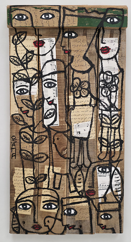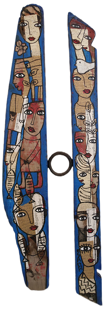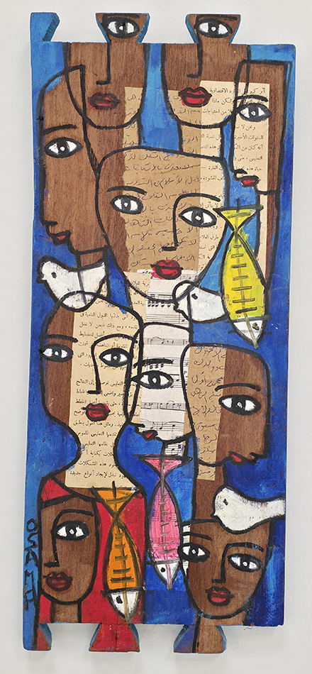Née en 1961, vit et travaille à Nantes 44. Né au Caire en 1961, Osama El Hefny a étudié le droit et parallèlement les arts en Égypte où il expose régulièrement entre 1980 et 1984. En 1989, il s’installe en France, à Nantes pour poursuivre ses études de droit et commencer à travailler. Suite à un divorce, il repart en Égypte. Après six mois, il revient en France et se réinsère dans le monde du travail, grâce à l’association, l’homme debout pour laquelle il réalise des peintures sur meubles. Il vit et travaille à Nantes dans un petit appartement envahi par ses nombreuses productions à l’huile. Il œuvre sur différents supports, sur des vieilles étagères, des portes de meubles, des bois récoltés sur les côtes vendéennes ou dans les cimetières de bateaux… Il rapporte de ses séjours en Égypte où il retourne régulièrement des cadres de fenêtres où il insère ses peintures. Dans ses peintures, il intègre des journaux égyptiens, des tissus qui servent normalement à décorer les tentes de cérémonie…Les humains sont très présents, souvent de face, yeux grands ouverts, parés de couleurs ensoleillées. Malgré ses nombreuses années en France, Osama reste un artiste oriental. À travers ses œuvres, Osama compose un langage visuel où la mémoire, l’identité et la résistance prennent forme. Qu’il peigne sur papier, sur bois ou sur des fragments de nature, ses figures féminines aux regards intenses deviennent des icônes contemporaines : elles veillent, témoignent et racontent. Les visages, souvent multipliés et entremêlés, oscillent entre l’individuel et le collectif, incarnant à la fois l’intimité d’une histoire personnelle et la force d’une mémoire partagée. Les pages manuscrites, les partitions musicales, le bois usé et les couleurs vives s’entrelacent pour créer un palimpseste de récits et d’émotions. Les oiseaux, les yeux persistants, le rouge éclatant des lèvres ou des fonds deviennent des signes récurrents : symboles d’envol, de vitalité et de résistance face au temps et à l’effacement. L’œuvre d’Osama se déploie ainsi comme une mosaïque de voix et de présences : une mémoire visuelle où la femme se fait à la fois sujet et symbole, inscrite dans un dialogue entre tradition et avenir. IA à partir de 3 photos d’oeuvres