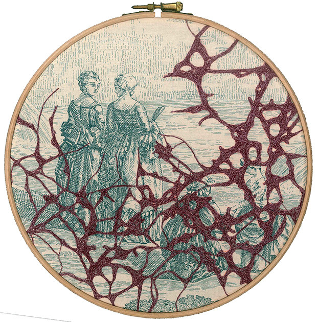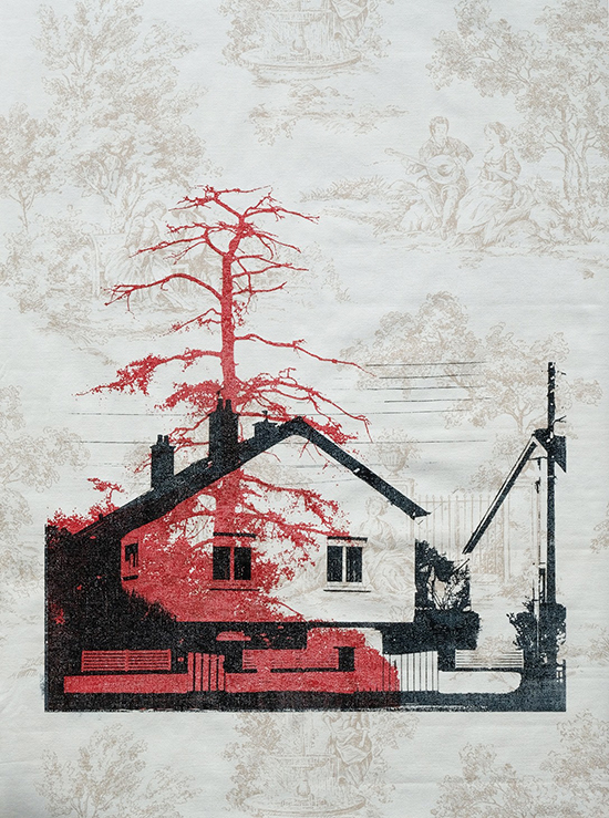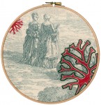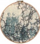Née en 1971, vit et travaille près de Châteaubriant. J'ai fait des études de lettres, d'architecture (architecte DPLG à Nantes), et d'urbanisme (DESS de Toulouse le Mirail). J'ai passé mon enfance dans la campagne de l'agglomération rennaise, puis ai habité à Rennes, Nantes, Marseille et Toulouse pour revenir à Nantes, puis en Sud-Loire (plaine maraichère) et enfin dans la campagne de Châteaubriant. J'ai très peu exercé en tant qu'architecte. En tant qu'urbaniste, j'ai proposé aux collectivités de travailler sur la ville à partir de l'expérience vécue des habitants concernés par le projet urbain, ce à l'aide d'interventions d'artistes de tous les domaines (photographie, son, théâtre, arts plastiques etc.). Bien qu'ayant toujours pratiqué les arts plastiques (collage, photographie, dessin, peinture, modelage), c'est cette expérience qui m'a décidée à quitter le monde de la ville et de la construction pour m'impliquer pleinement dans les arts plastiques, toujours à partir de récits de vie. Je suis inscrite à la Maison des Artistes depuis mai 2010. Je pratique le dessin (encre de chine surtout), la sérigraphie sur papier-peint, la photographie, la broderie machine, la cyanographie sur tissu. Cyanotypes La cyanographie est un procédé photographique ancien, qui met en œuvre d'autres produits photosensibles que la photographie argentique… Je réalise des cyanotypes sur tissu à partir de photos que j'ai prises dans la campagne de Châteaubriant. Je travaille les photographies sur informatique puis je génère des négatifs que j'applique ensuite sur des tissus auparavant trempés dans la solution photosensible puis séchés à l'ombre. Je ne travaille pas avec la lumière du soleil, qui est très aléatoire et surtout insuffisante en hiver sous nos latitudes. Je travaille avec une insoleuse qui génère de puissants UV. Broderies Je brode à la machine à coudre, en utilisant le point le plus simple, de la même manière que j'utiliserais un crayon, la couture devenant un trait fin que je répète en allers et retours jusqu'à obtenir le motif désiré. J'y mets en relation la toile de Jouy, représentant des scènes riches et convenues, avec des formes d'alliens, qui viennent brutaliser et contredire l'harmonie qui semblait régner dans le motif initial. D'une certaine manière, je fais intervenir une « inquiétante étrangeté » dans la prétendue paix de nos conforts bourgeois. Sérigraphies sur papier-peint La sérigraphie est un procédé d'impression qui est accessible à l'artisanat, bien qu'il puisse aussi être réalisé de façon industrielle. C'est une technique qui met en œuvre des produits photosensibles, afin de réaliser un pochoir sur une toile tramée tendue sur un cadre (qu'on appelle « écran »). Je crée des sérigraphies sur papier-peint afin de faire dialoguer ce qui ressort de nos intimités (le papier-peint collé sur nos murs « voit » se dérouler nos gestes quotidiens et intimes) avec, d'une part nos rêves de « réussite » et nos prétentions (posséder une maison et l'exposer à la vue de tous), d'autre part le caractère indomptable de la vie (les arbres). Pour réaliser chacune de ces quatre sérigraphies en deux couleurs, deux passages ont été nécessaires.