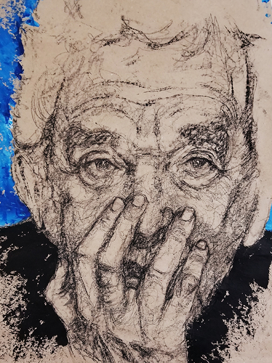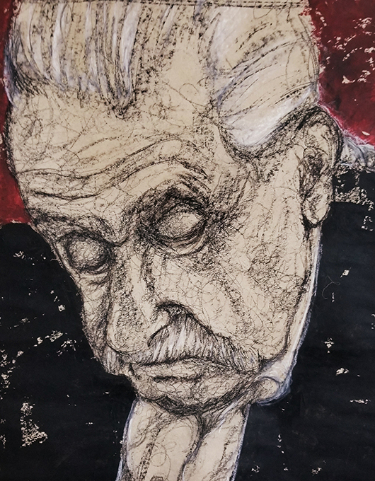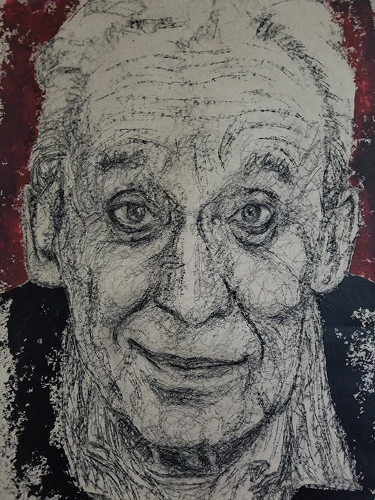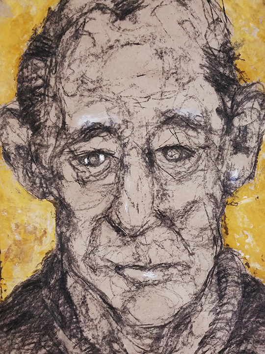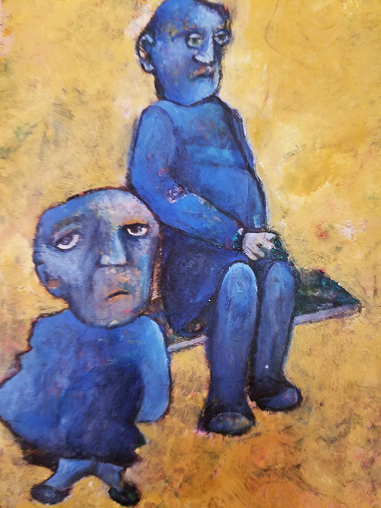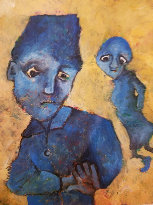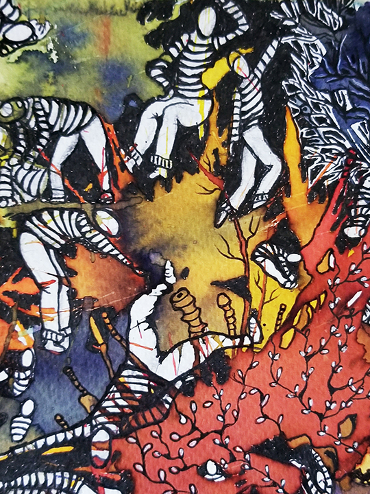 Née en 1966, vit et travaille à Saffré «J’ai grandi en ville, au bord de la mer touristique. J’ai su très vite que je préférais la campagne pensant n’y trouver que des oiseaux, des chats et des chevaux. J’ai donc fait des études agricoles et ai passé mon BAFA (brevet d’animateur) en parallèle. Celui-ci m’a permis d’encadrer bon nombre de groupes et cette expérience me servira par la suite. En 1998, après avoir eu divers emplois alimentaires, je me suis installée en ferme, pour y élever des vaches laitières et accueillir des chevaux en pension. Mon passe-temps favori était de dessiner les chevaux et les vaches dans les champs. Tout était prétexte à dessiner, à peindre et à sculpter. Je me nourrissais de mon quotidien à la campagne et transformais mes observations en images. Dans ma famille, tous les membres peignaient et dessinaient et j’ai toujours baigné dans un univers où l'imaginaire a toute sa place. C’est donc tout naturellement que j’ai entretenu un intérêt pour l’art et la création. En 2010, souhaitant partager ma passion pour les arts plastiques, j’ouvre et anime chez moi, un espace dédié à la création à l’intention des enfants et des adultes de ma commune. Ainsi naît l’Atelier de Poche, dont l’objectif n’est pas de faire du beau et du réussi mais plutôt du vrai, au plus près de soi. Cette expérience m’a permis de me rencontrer pour mieux rencontrer les autres. Cet atelier, devenu associatif, est toujours en activité. Autodidacte, j’ai choisi néanmoins de m’inscrire en 2005 à l’école des Beaux-Arts de Nantes pour y suivre des cours du soir pendant une dizaine d’années. Découvrant de nouvelles approches, je me suis passionnée pour la réalisation de portraits. De nature solitaire et plutôt introvertie, j’ai découvert que finalement j’aimais les gens et que mon sujet de prédilection était de les raconter. Ainsi, en illustrant leurs mimiques, leurs postures, je ne parle dans mon travail que de relations d’interdépendance et de liaisons. Je m’intéresse particulièrement à mes semblables et leurs états émotionnels plutôt qu’à ce qui les entourent. A partir d’anciennes peintures abandonnées au fond d’un tiroir, riches de couleurs posées là sans conscience ou tachées de quelques coups de crayons maladroits, je tire le fil de la création comme on détricote un vieux pull. Plus le travail de base est dense en formes et en couleurs, plus mon terrain de jeu est riche et source d’interprétation. Je laisse les traits s’entremêler, promène mon regard sur l’imbroglio de brins et de cordons et surprend une forme qui me donne à rêver, à raconter. Puis, trouve une autre composition qui me conduit à donner corps et infimes détails au tableau. Mon art naît d’illusions que je suis seule à voir. Je traduis mes confusions visuelles en compagnes de route. D’un naturel rêveur et fantaisiste, j’aime à trouver sur mes toiles des personnages tendres, espiègles, cruels ou drôles. Je mélange dans cette galerie des notions qui m’amusent : paradoxe, absurde et bizarre. Par mon approche plastique basée sur le hasard, afin d’accéder au monde de l’inconscient, j’exploite plutôt des associations d’éléments inattendus qui n’ont pas de lien entre eux dans le but de proposer un monde improbable et métaphorique. C’est par ce biais que je choisis d’aborder dans mon travail, tous les mystères des relations humaines qui me fascinent et me dépassent parfois. C'est en effet à partir des postures et des regards que les relations sensorielles avec le monde s’établissent. Je cherche à construire un lien avec des spectateurs dans le but plus large de promouvoir l'expression et la communication.»