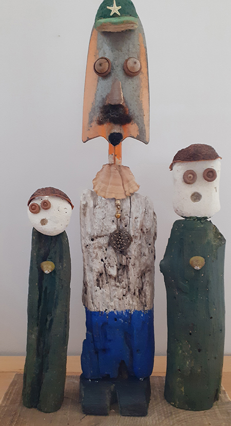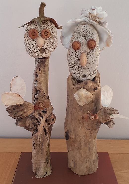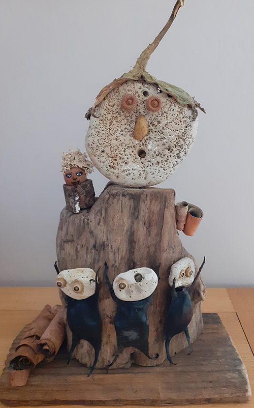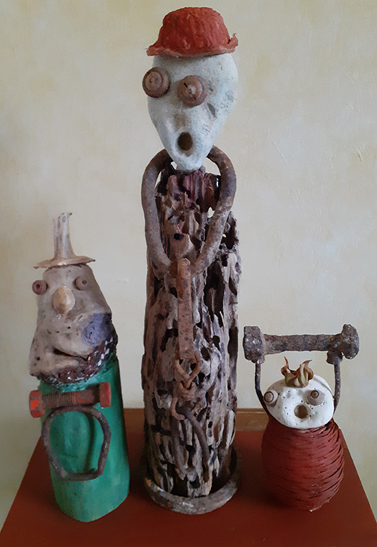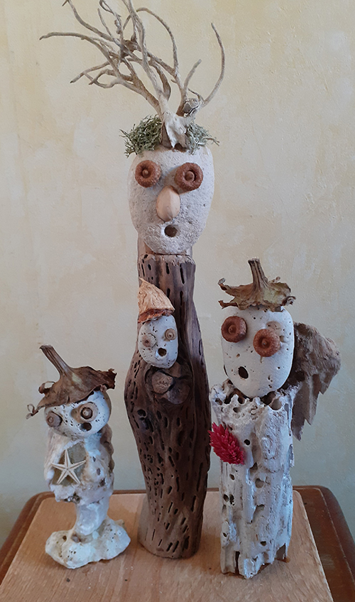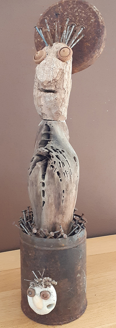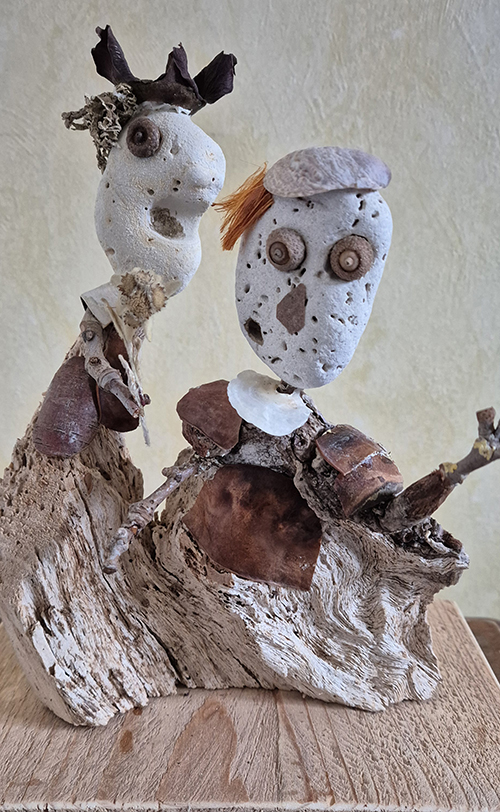 Né en 1951, vit et travaille près de Poitiers Enfance et adolescence à Cognac. Longues études (car entrecoupées de périodes un peu bohème) à Poitiers. Petits boulots de 1978 à 1982 puis informaticien dans l'éducation nationale de 1983 à 2013. Les activités familiales, les voyages et le sport occupent une grande partie de mon début de retraite. Ce n'est qu'en 2022 que je commence à assembler des éléments végétaux pour créer des petits personnages, à la plus grande joie de nos petits-enfants. Je redécouvre peu à peu le plaisir du travail manuel, mes assemblages deviennent plus élaborés, et comme ils semblent susciter un certain intérêt, je commence à les publier sur FB à partir de 2023. A la base de mon travail, aucun concept ni message, pas de symbolisme assumé. La première étape, c'est de parcourir les bois et les sentiers de montagne, les bords de rivières et les lagunes, mais aussi les vides-greniers et les ressourceries, à la recherche de trésors qui pourront être source d'inspiration. Je commence souvent à partir d'une forme qui me plaît (morceau de bois, galet), puis je taille, je ponce, je cloue, je colle, j'ajoute, je retire jusqu'à trouver une composition qui me plaise. Puis habillage avec végétaux, algues, parfois métaux et os. Enfin éventuellement peinture ou lasure. Je ne choisis le titre qu'en milieu de parcours. Cette vocation pour le moins tardive me permet d'occuper mon temps libre. Devenue addictive, elle me permet aussi en ces temps difficile d'oublier le désordre du monde et la folie humaine. Que signifie ces groupes de personnages qui semblent en attente, yeux ronds et bouche bée, je n'en sais rien, mais je suis heureux si certains y trouvent une force expressive, un peu d'humour et de poésie