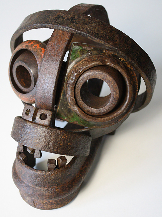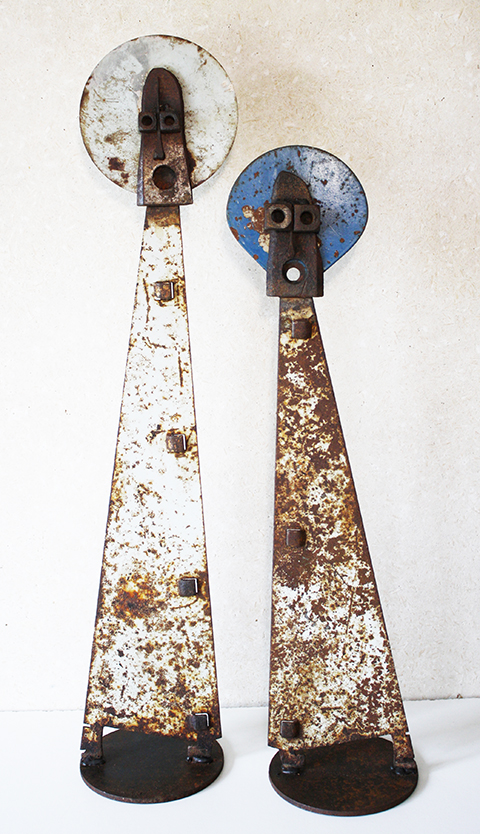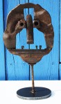 Né en 1977, vit et travaille à Derval 44. Bac pro, horticulture, spécialité plantes tropicales. Travaille un temps en jardinerie puis traverse le Sahara, direction Mauritanie, au volant d’une 505. Magasinier, voyage au Mexique, Bolivie, Pérou. Valet de chambre, dans les Alpes pendant une saison d’hiver. Vend des sapins de Noël, travaille quelque temps dans la rénovation de l'habitat pour une entreprise de Saffré "Rénove Habitat Service". Il est membre fondateur de l'association Recycle et Don, basée à Conquereuil, dont il sera salarié pendant 2 ans. Il va ensuite devenir intermittent du spectacle et parcourir durant ces 10 dernières années les routes de France et d'Europe au sein de la Compagnie de théâtre de rue "Paris Bénarès" en tant que manipulateur de marionnettes géantes et enfin début 2025 il découvre l'univers du tout petit en suivant une formation professionnelle en Stop Motion (film d'animation), Pour commencer, il a ramassé quelques morceaux de métal rouillé, puis sans vraiment y penser les a assemblés et a ainsi donné naissance à des créatures pleines de surprises. Certains y ont trouvé de l’intérêt et les ont dénommées sculptures. Les personnages se sont accumulés, les expositions sont arrivées, depuis quelque temps, il allie le métal au vieux bois et participe aussi aux actions du groupe d’artistes : L’Arête Inutile. Créé pour un usage, l'objet perd son utilité et est remplacé par un plus "moderne" plus performant. Le rebut est le destin commun des objets ainsi frappés "d'obsolescence", après avoir fait leur temps. C'est pour soustraire ces objets à une funeste destruction que des artistes, tel Gaëtan Grimaud, s'en emparent pour leur donner une autre vie. Fer et bois, l’improbable alliance ! Que serait notre environnement sans le fer et le bois ? Au cœur des constructions et des objets, leur utilité suffit à en dire la noblesse. Dans l’ombre, ils rendent des services dont l’homme ne saurait se passer, dans l’ordinaire des jours. Confiés au fer à souder et aux outils de l’artiste, les mêmes matériaux sont transfigurés. Sous des formes improbables, ils s’adressent à l’âme de qui s’en empare, en même temps qu’ils permettent l’expression de celle de leurs créateurs, qui leur donnent des formes improbables. L’intrusion soudaine et insolite des œuvres sollicite des sentiments qui n’obéissent pas aux injonctions de l’esprit. Ils renvoient chacun à sa part indéchiffrable et inaccessible de mystère. Hubert Bouchet Les sculptures de Gaëtan Grimaud naissent de l’assemblage de bois usés et de fragments métalliques récupérés. Dans ce jeu de matières brutes, il compose des figures à la fois décalées et familières, où l’humain affleure dans l’improbable rencontre des objets. Ses personnages, aux silhouettes fragiles et aux visages bricolés de boulons, engrenages et morceaux de ferraille, dégagent une poésie singulière : celle d’une humanité recomposée à partir de ce qui est rejeté. À travers eux, l’artiste interroge la mémoire des matériaux et leur redonne une présence vibrante. Son œuvre se situe à la frontière entre sculpture et récit : chaque assemblage devient une petite fable silencieuse, où tendresse, humour et ironie se mêlent pour donner au rebut une seconde vie pleine d’humanité. IA à partir d’une photo avec 3 sculptures.