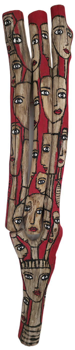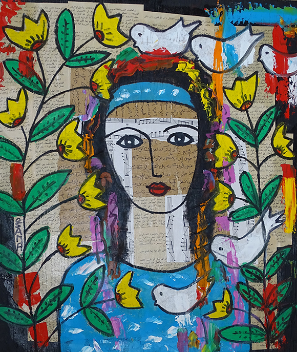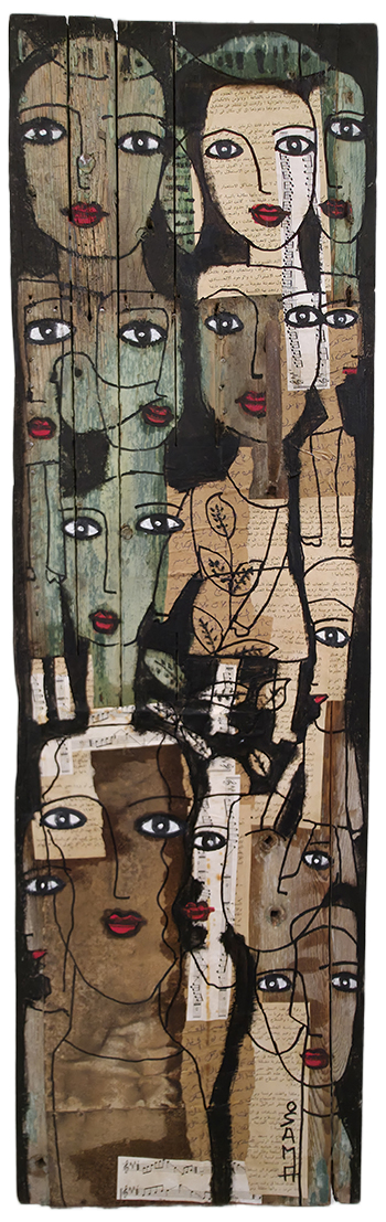 Née en 1961, vit et travaille à Nantes 44. Né au Caire en 1961, Osama El Hefny a étudié le droit et parallèlement les arts en Égypte où il expose régulièrement entre 1980 et 1984. En 1989, il s’installe en France, à Nantes pour poursuivre ses études de droit et commencer à travailler. Suite à un divorce, il repart en Égypte. Après six mois, il revient en France et se réinsère dans le monde du travail, grâce à l’association, l’homme debout pour laquelle il réalise des peintures sur meubles. Il vit et travaille à Nantes dans un petit appartement envahi par ses nombreuses productions à l’huile. Il œuvre sur différents supports, sur des vieilles étagères, des portes de meubles, des bois récoltés sur les côtes vendéennes ou dans les cimetières de bateaux… Il rapporte de ses séjours en Égypte où il retourne régulièrement des cadres de fenêtres où il insère ses peintures. Dans ses peintures, il intègre des journaux égyptiens, des tissus qui servent normalement à décorer les tentes de cérémonie…Les humains sont très présents, souvent de face, yeux grands ouverts, parés de couleurs ensoleillées. Malgré ses nombreuses années en France, Osama reste un artiste oriental. À travers ses œuvres, Osama compose un langage visuel où la mémoire, l’identité et la résistance prennent forme. Qu’il peigne sur papier, sur bois ou sur des fragments de nature, ses figures féminines aux regards intenses deviennent des icônes contemporaines : elles veillent, témoignent et racontent. Les visages, souvent multipliés et entremêlés, oscillent entre l’individuel et le collectif, incarnant à la fois l’intimité d’une histoire personnelle et la force d’une mémoire partagée. Les pages manuscrites, les partitions musicales, le bois usé et les couleurs vives s’entrelacent pour créer un palimpseste de récits et d’émotions. Les oiseaux, les yeux persistants, le rouge éclatant des lèvres ou des fonds deviennent des signes récurrents : symboles d’envol, de vitalité et de résistance face au temps et à l’effacement. L’œuvre d’Osama se déploie ainsi comme une mosaïque de voix et de présences : une mémoire visuelle où la femme se fait à la fois sujet et symbole, inscrite dans un dialogue entre tradition et avenir. IA à partir de 3 photos d’oeuvres
